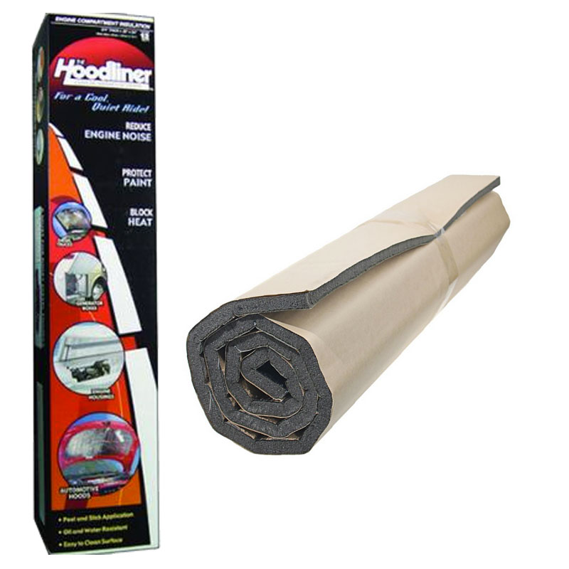 Dress up your engine compartment with a Dynamat Hoodliner. The 3/4"-thick "Sound Soaker" foam absorbs up to 87% of your engine noise, delivering a quieter listening experience in your vehicle. The reinforced aluminum skin creates a water/oil barrier that reflects 97% of radiant heat, protecting your hood's finish.