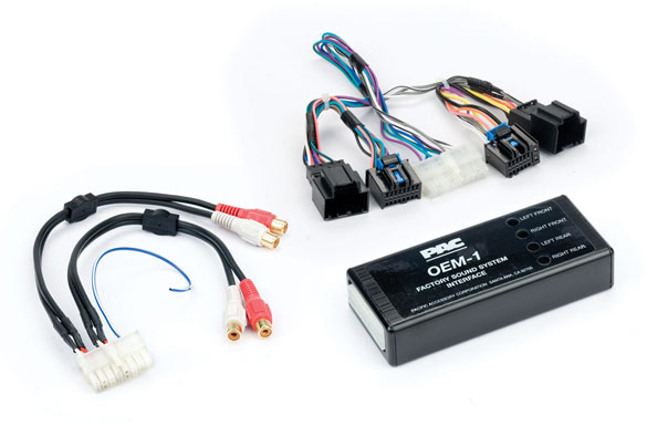 OEM-1 with a vehicle specific harness plugs into the vehicle's wiring and provides a stereo RCA audio output for adding aftermarket amplification. Provides full range audio output 20-20,000Hz. Audio output level is controlled by the volume of the factory radio.
