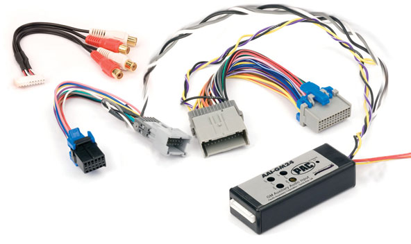 Dual Auxiliary Audio Input Interface for Select General Motors Vehicles Connects to the 24-pin auxiliary input port on the back of the factory radio. Provides two pairs of stereo inputs.