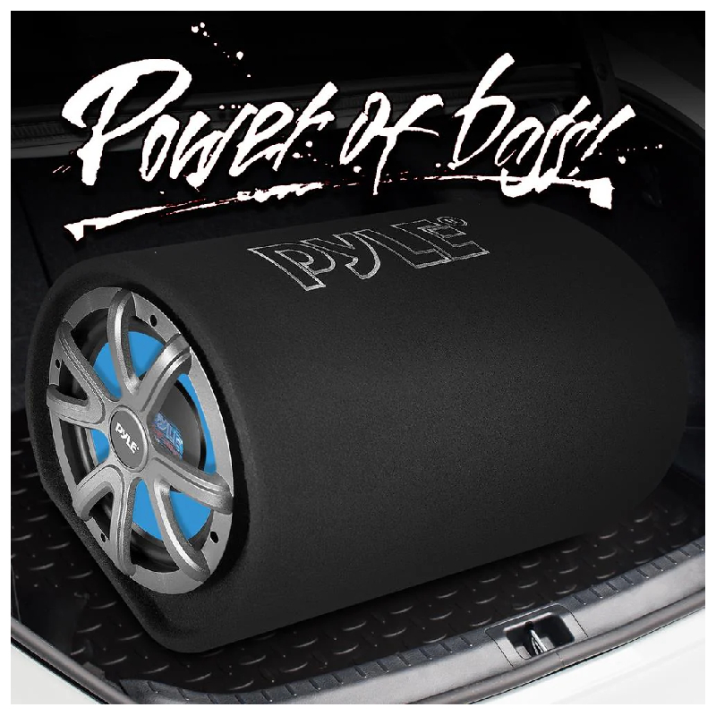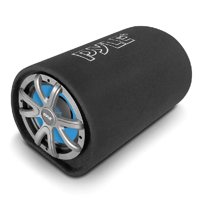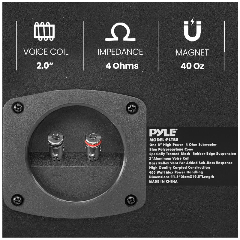 The Pyle Blue Wave subwoofer delivers 400 watts of powerful bass. Its 8-inch tube design features high-quality carpeting for a classic appearance. It includes a blue polypropylene cone and specially treated black rubber edge suspension to ensure clear, distortion-free sound. The 2-inch aluminum voice coil provides strong performance, complemented by a bass reflex vent that enhances sub-bass, resulting in a frequency response from 30 Hz to 700 kHz.