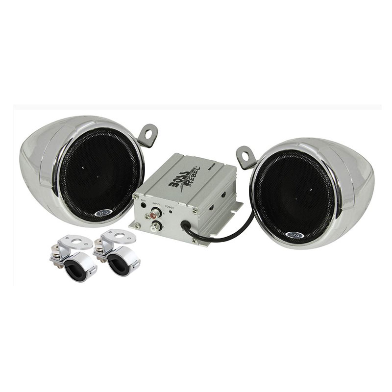 Take great music with you on the roads and trails with the Boss Audio MC400 Chrome Weatherproof Motorcycle Sound System. Blast your tunes on your 12V Motorcycle, Scooter or ATV with the 600 Watt Max Power Amp and a pair of 3-inch Full Range Speakers. Hook your Smartphone or MP3 Player up to the Auxiliary Input. Turn up the sound with the Wired Remote Volume Control. The MC400 features Weatherproof Speakers to provide protection against the elements.