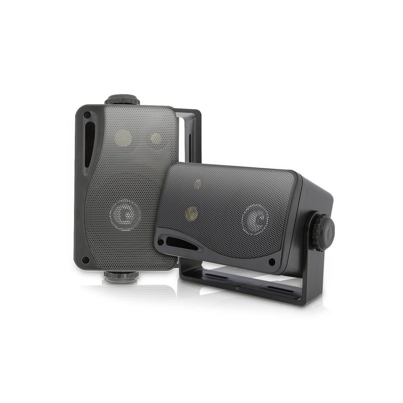 The PLMR24B consists of a pair of 3.5-inch, 200-watt, durable weatherproof speakers designed for various outdoor settings such as decks, backyards, poolsides, boats, or marine vehicles. They are fully waterproof with a removable, rustproof grill for easy cleaning. These 3-way speakers deliver comprehensive sound, featuring a 3.5-inch aluminum injection cone woofer with a 24 oz. magnet for bass, a 1.75-inch wide dispersion cone for midrange, and a 1-inch super dome tweeter for highs. The built-in capacitor crossover network simplifies setup, and they connect easily with quick connect terminals. A bass reflex vent enhances low-end performance. Frequency response ranges from 70 Hz to 21 kHz. The package includes a complete mounting kit and wires for installation.