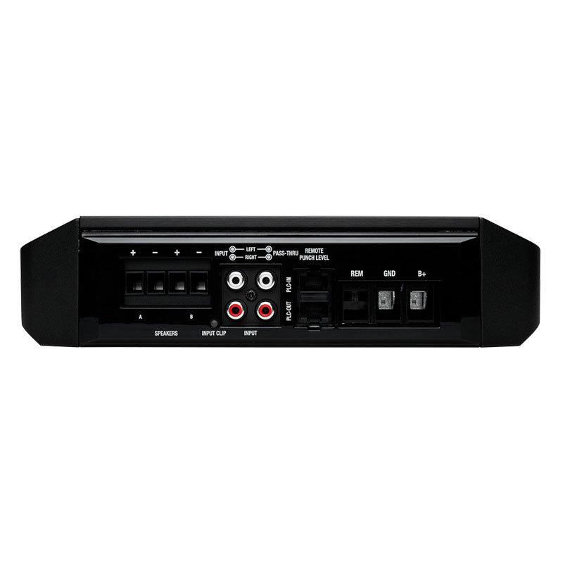 The Punch P400X1 mono amplifier is specifically designed for medium to high-powered subwoofer applications. It’s variable crossover and built-in Punch EQ allow for precise tuning of Bass frequencies, and its 2-Ohm mono stability is perfect for running up to four 4-Ohm DVC subwoofers. You can also add-on the PLC2 Remote Punch Level Control to control equalization from under the dash or center console. Sized to fit under any seat, you can hide this amplifier and have them guessing where the amp is.