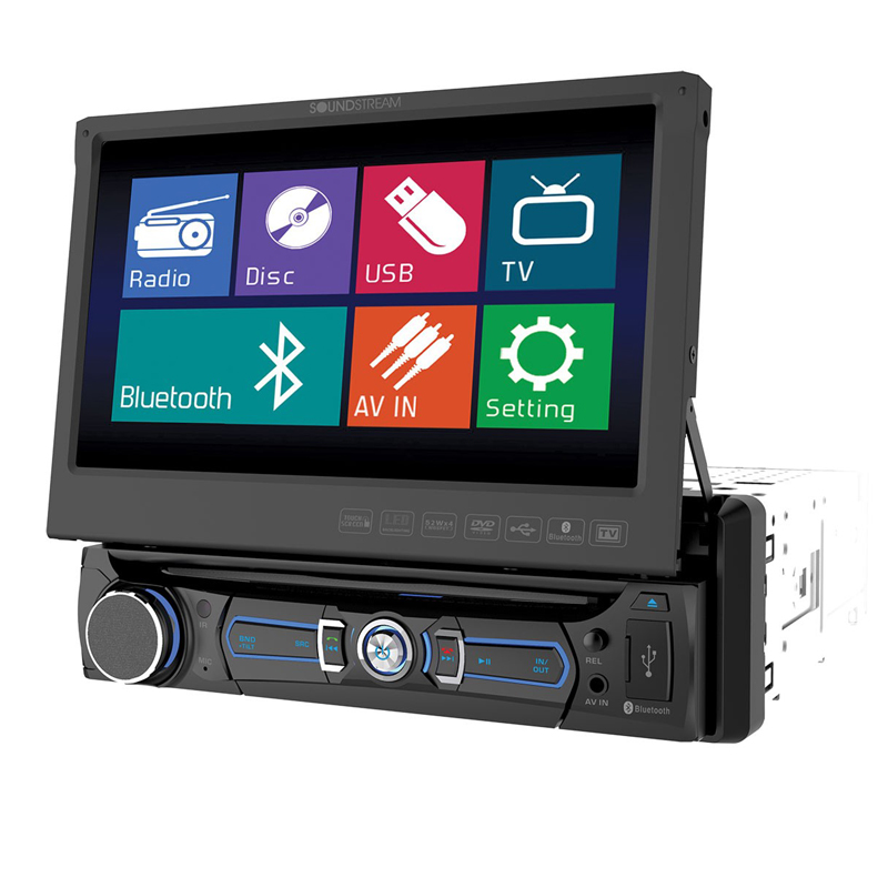 • 1-DIN Multimedia Receiver w/ Motorized 7” LCD Touch Screen