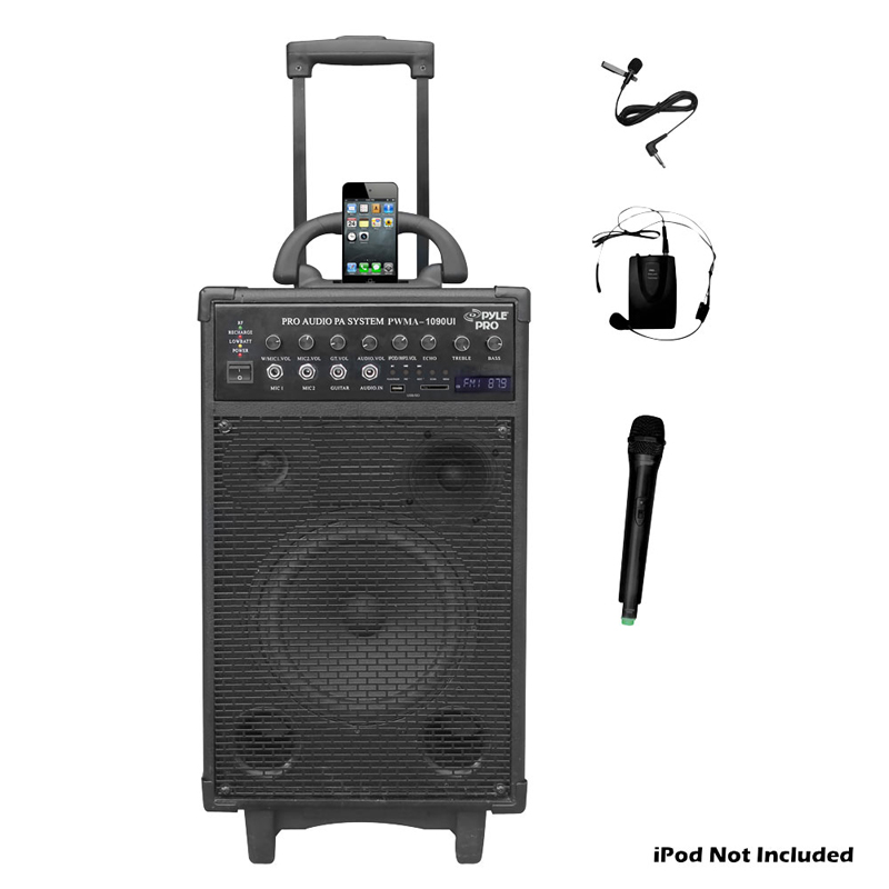 The PWMA1090UI is a portable PA/mobile entertainment system on wheels, and it’s packed with all the latest and greatest features. It’s equipped with an iPod dock connector that charges your iPod or iPhone and lets you play your favorite music over the powerful 800 watt speaker. It has four ¼” inputs on the front, each with its own volume control, for a total balance of sound.