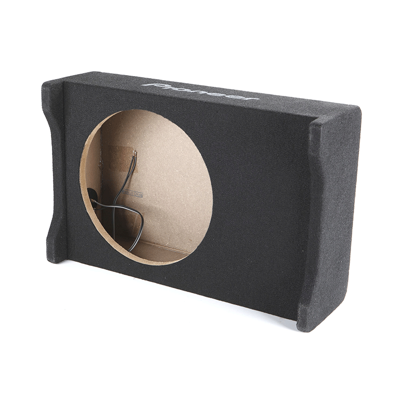 The innovative, compact, space-saving enclosure design makes it easy for the UD-SW250D to be installed freely in a variety of automobile trunk spaces or inside pickup truck cabins. The UD-SW100D is constructed from high-quality, sturdy 5/8" MDF. The exterior is covered in black carpet. Heavy-duty Ni-Cr push-type terminals make connection to the amplifier a snap. Compatible with the Pioneer TS-SW2502S4 10" shallow subwoofer (sold separately). By directing the subwoofer diaphragm downward, the UD-SW250D radiates bass with superior efficiency for richer, deeper low-frequency sound regardless of the enclosure’s installed position.