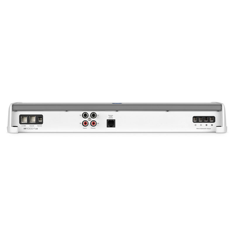 With the addition of an HD-RLC remote level control (sold separately), the amplifier's subwoofer output level or master volume for all channels can be directly controlled from the helm. The M1000/1v2 also features the v2 Spec feature set, which consists of automatic turn-on capability (via signal sensing or DC-offset sensing), and a dual-range differential-balanced input section able to handle a wide range of input voltage levels.