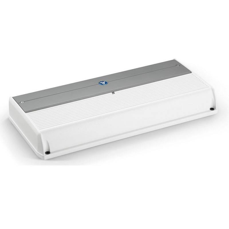 This amplifier features white and gray powder-coat finish, a gasketed cover for the controls and stainless steel hardware for durability in the marine environment.