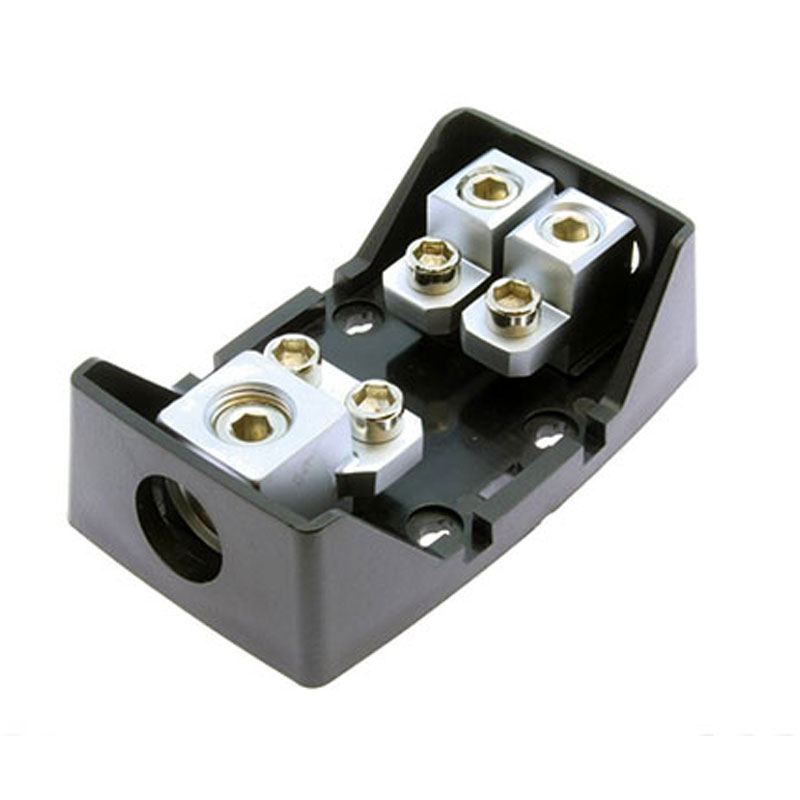 The KICKER® FHD Dual Fuse Holder accepts 1/0 – 8 AWG power cables and accommodates any size AFS fuse. The wire receptacles work with most wire sizes for a clean, sharp install and a negative-post adapter collar that locks into place for a tight grip.