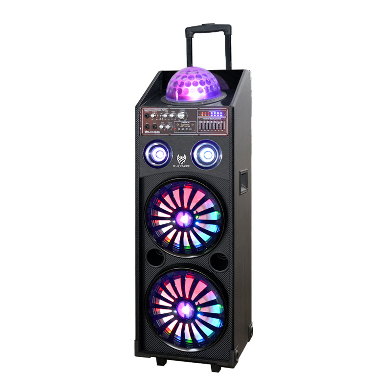 The BLS-5210BT is a portable audio entertainment system with integrated LED accent lighting. The unit boasts an mp3 music player capable of playing audio files from USB and SD cards as well as Bluetooth connectivity for wireless music streaming. Additionally, there are front mounted ¼” guitar and microphone inputs so this unit can double as a guitar amp. With a collapsible luggage style carrying handle and built in caster wheels, this unit makes the perfect mobile party machine with extreme capabilities. Sound quality is achieved by its dual 10” subwoofers and dual 3” bullet tweeters totaling 2300W of musical power.