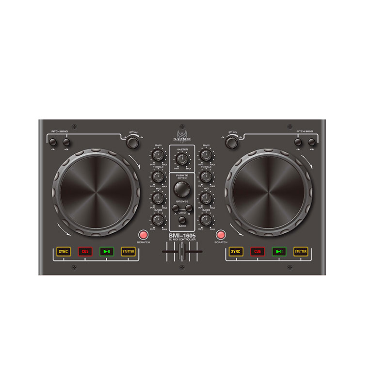 The BMI-1605 is a fully digital USB based DJ Midi Controller that is both MAC and PC Compatible. At your fingertips are two jog wheels for scratching, searching and cuing. This controller has pitch, bass, treble and gain controls as well as a cross fader. The input/output and power supply are all controlled by one USB 2.0 connection to keep clutter to a minimum. This controller is simple enough for beginners to use but its features are robust enough for expert use.
