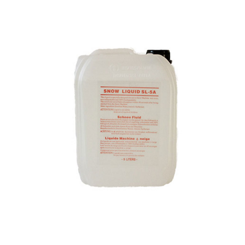 Snow liquid, 5l Especially designed for use in snow machine. Non-toxic, non-flammable and 100% biodegradable. Artificial snow flakes disappear within 40 seconds after being emitted from the snow machine. Main ingredients: distilled water, snionic surfactant