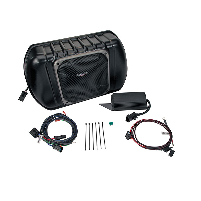Included with the system are a square 10" subwoofer in a custom enclosure, subwoofer amp with custom mounting bracket, and all the necessary cables to power the amplifier and connect to the factory radio.