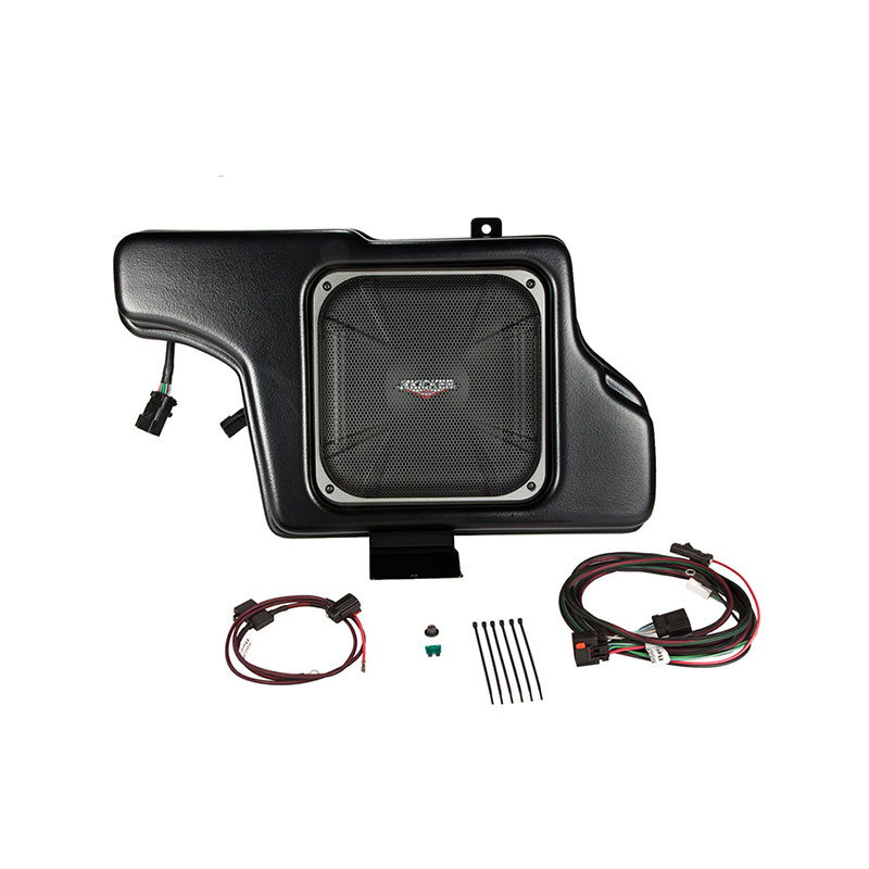 The custom enclosure is loaded with a single, square 10" Kicker subwoofer, powered by a 200-watt amplifier mounted to the enclosure. It includes big-bass subwoofers in a small space, high-efficiency, low power-draw amplifiers, a unique sound signature from multi-channel amps with DSP, and all in factory mounting locations with no modifications.