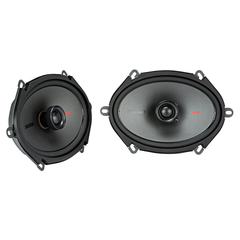 These KICKER® door speakers are available in nine different sizes, and include a minimally protruding tweeter with a large silk dome, polypropylene woofer and tough rubber surrounds. Our coaxials give you a smooth, distortion-free response that fits in nearly every ride out there - without interfering with the factory grilles.