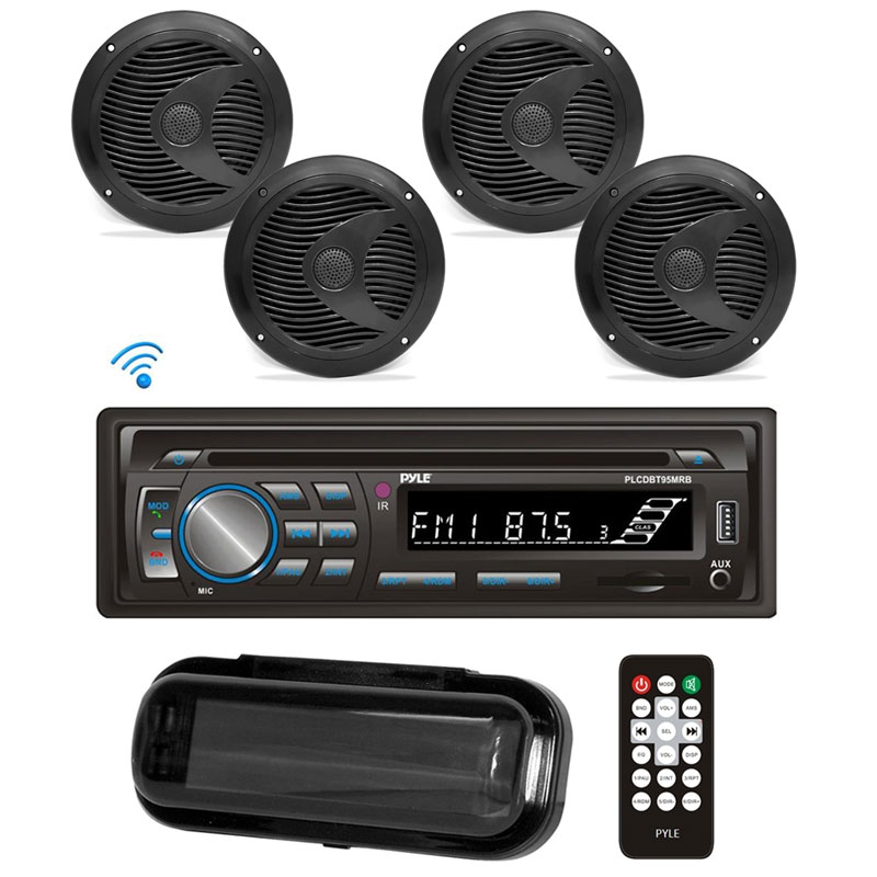 - Includes Stereo Receiver, (4) Waterproof Speakers + Accessory Kit