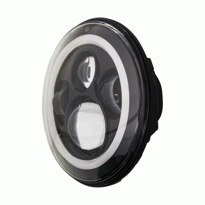 (4) 10 watt LEDs, White angel eye halo connects to running lights, 2000LM low beam – draws 1.9a at 13.8v, 3000LM high beam – draws 2.7a at 13.8v, LED color- 6500K, Polycarbonate lens cover is virtually unbreakable, H4 connector, and Designed for use with most motorcycles using a 7" headlight.