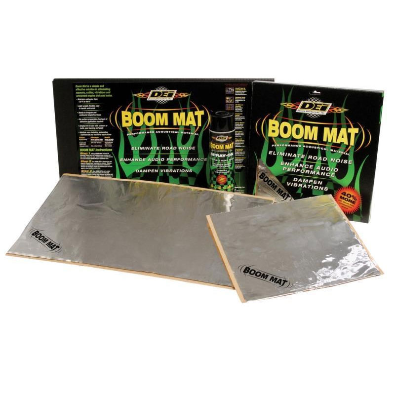 Boom Mat Damping Material solves the problem of noise, vibrations, squeaks and rattles that come from roads, stereos, engines & more. Boom Mat Vibration Damping Material is a premium quality damping material providing extreme noise damping for the most demanding commercial and sound competition applications. Interior panels vibrate and generate noise. Boom Mat stops that noise by trapping it between our thick, 4 mil aluminum stiffening top skin and the asphalt free, pure butyl, noise constraining layer. Plus worry-free no snag adhesion to any interior surface, vertical or overhead, even in the most demanding of temperature extremes. Those quality components are what makes Boom Mat Vibration Damping Material require only 25-50% coverage to get the job done. This saves weight, material cost and installation time.