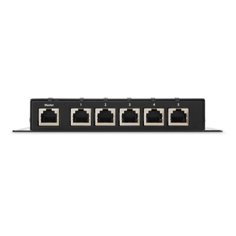 For data networking purposes, the VXi-HUB is equipped with one Master and five Slave JLid-COMM connections, permitting the networking of up to six VXi amplifiers using standard CAT5e cables (one master amplifier and five slave amplifiers)