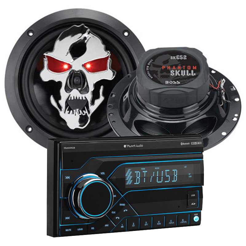 Planet Audio PB455RGB Double DIN Digital Media/AM/FM Receiver, Bluetooth®-Enabled/Audio Streaming with 240 Watts Max Power + Boss Audio SK653 6-1/2" 300W 3-Way Phantom Skull Series Car Audio Speakers - EXCLUSIVE PACKAGE