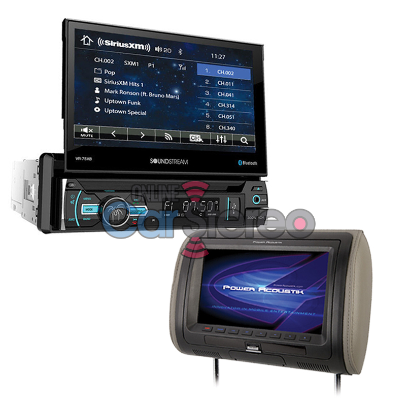 Soundstream VR-75B 1-DIN 7” DVD/CD/MP3/AM/FM Touchscreen Bluetooth Receiver + Power Acoustik H-91CC Headrest Replacement with 9" High Resolution LCD Touchscreen Display