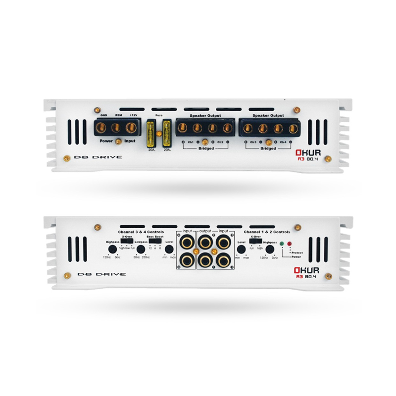 The APA 80.4 from DB Drive is a Class AB, 4-channel marine amplifier with a peak power of 560 watts RMS. This marine amplifier features a DC Offset Protection which means that this circuit will protect the output of the amplifier against DC voltage. The amplifier will shut down if the DC voltage is detected at the output stage. Also, the Short Circuit Protection feature will protect the amplifier by shutting down the amplifier when one of the speakers or wiring comes in contact with the ground. You can resume to normal operation by correcting the problem and turning the head unit off, then back on. APA 80.4 has a built-in crossovers with an option of low or high pass filtering. The Bass Boost feature is also available for added low frequency performance.
