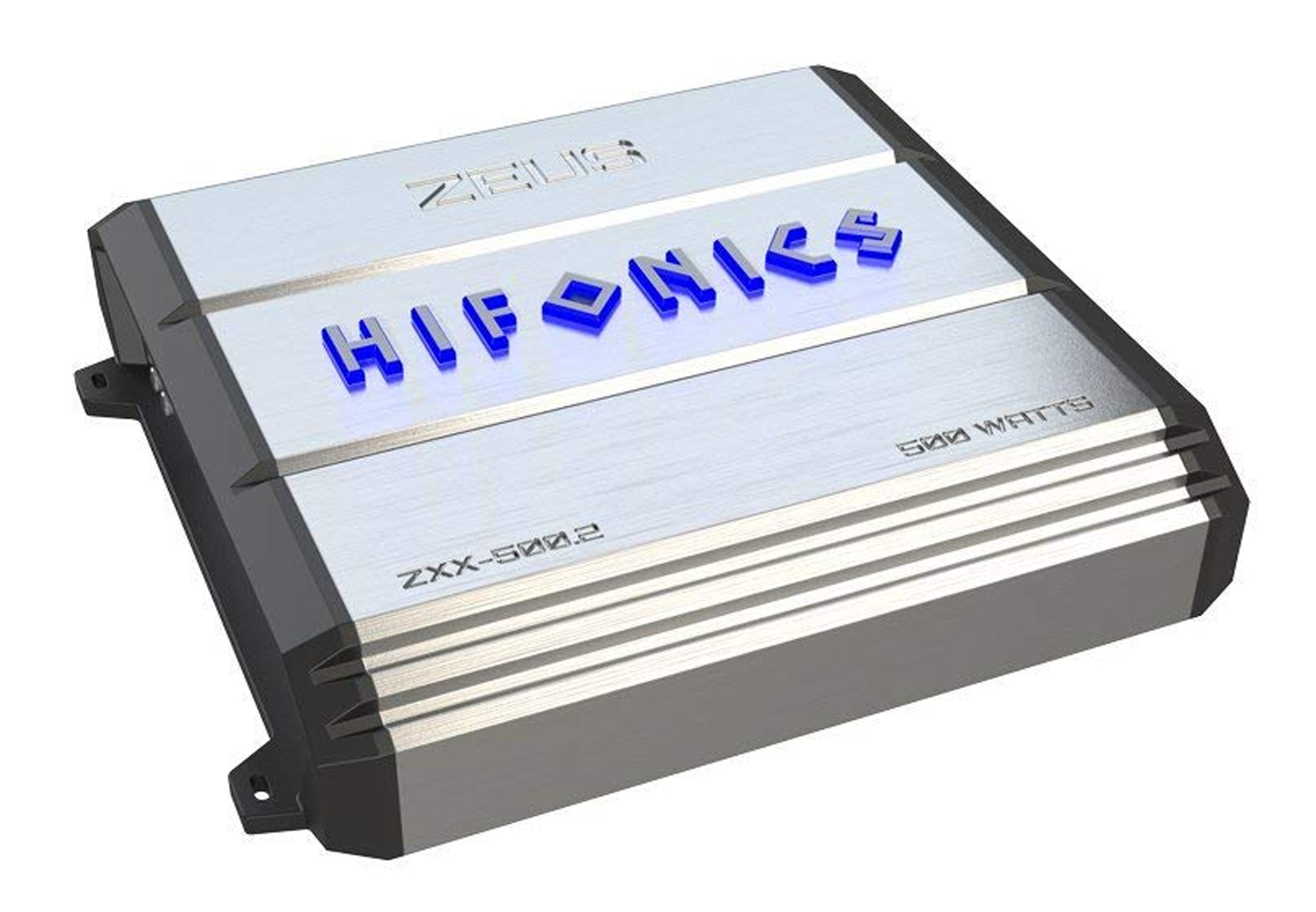 A classic Hifonics aluminum heatsink with a 500 Watt 2-channel, bridgeable Zeus car audio amplifier with onboard electronic crossover