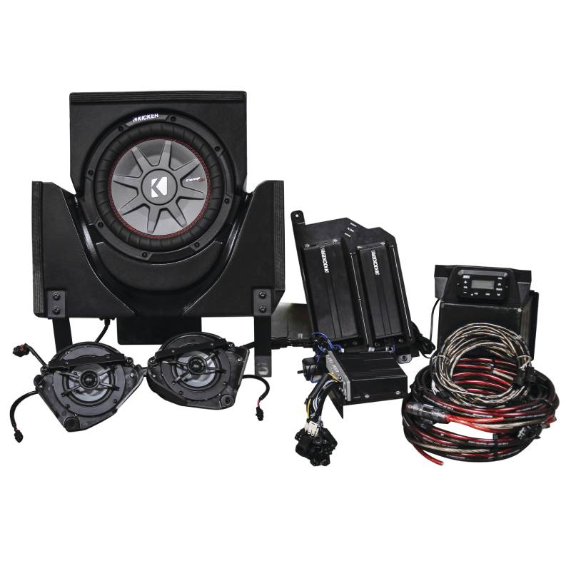KICKER and SSV Works deliver great tunes on the trail. This complete plug-and-play, three-speaker system is custom-made for your X3, right down to the wiring. This Phase 3 kit, which is made to fit your X3, comes with a 10-inch subwoofer, a 4-channel amplifier, a set of 6-1/2-inch speakers, an all-weather digital media receiver, and a mono amp for the sub.