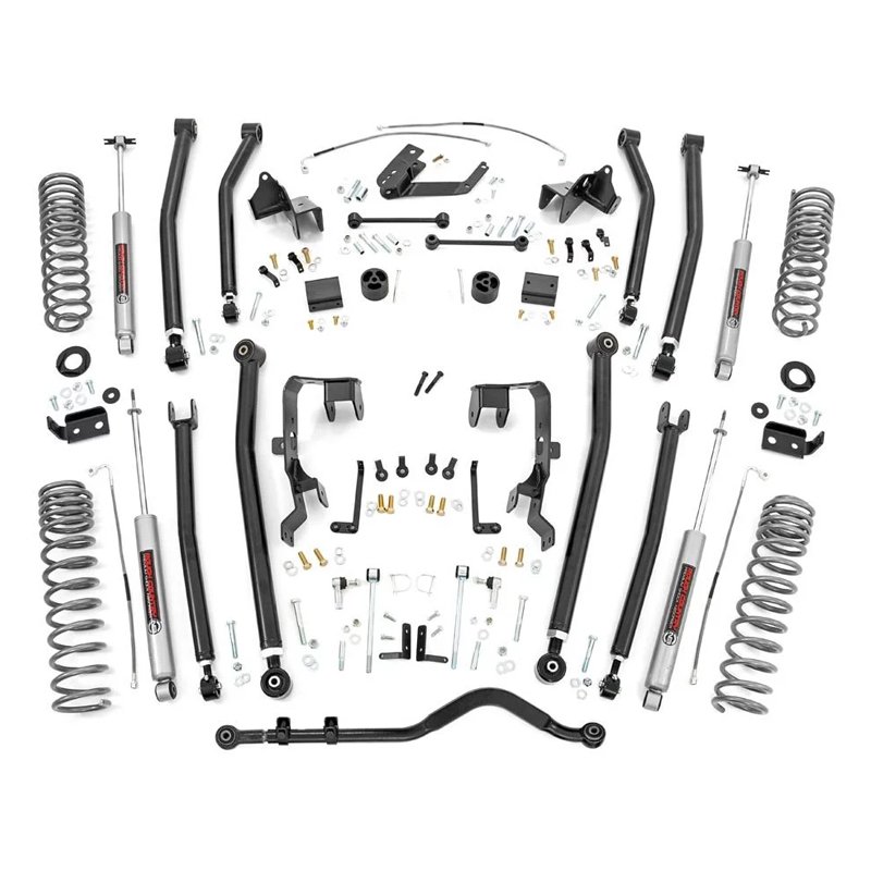 Achieve the ultimate flex and articulation while retaining a smooth highway ride quality with Rough Country's 4in Long Arm Suspension Lift Kit. This true 4-link setup offers incredible off-road performance while keeping the suspension geometry as close to the factory angles as possible. The result is a more capable suspension setup that can deliver jaw-dropping rock crawling performance while still giving the soft, lush highway ride quality a daily driver would enjoy.