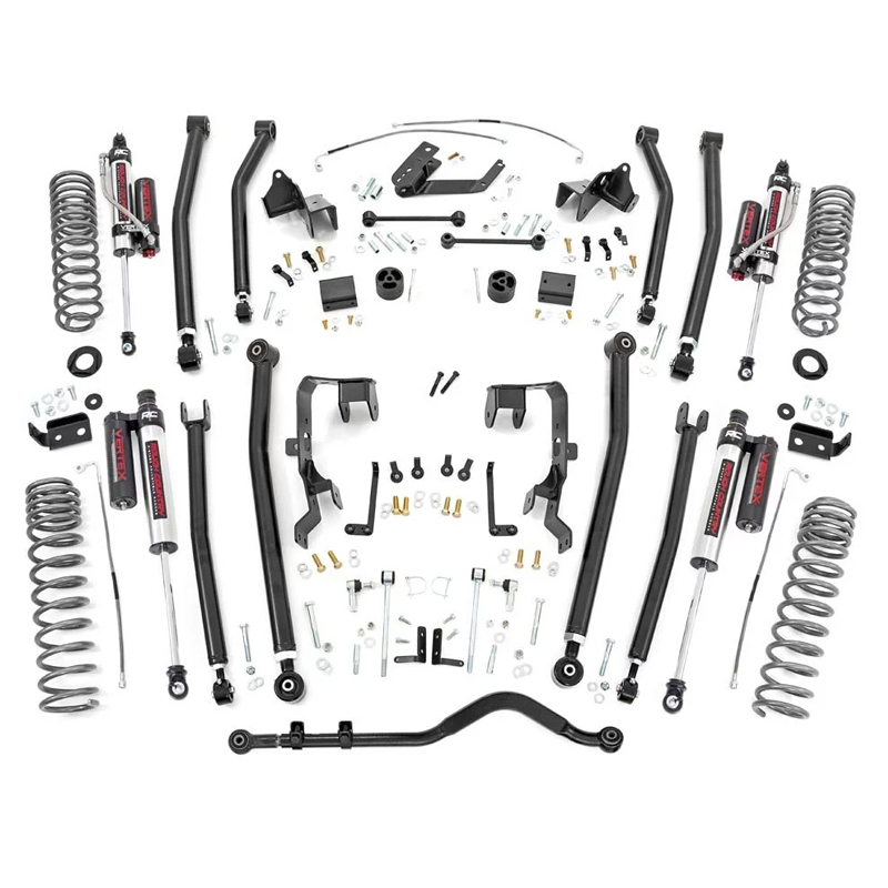The 4-link setup includes a full set of front and rear upper and lower adjustable control arms giving you full control to adjust the wheelbase and pinion angle. Each arm features Rough Country's adjustable flex joints with Clevite rubber bushings and is constructed out of durable heavy-wall DOM tubing for a long lifespan of flex and performance. All brackets are made of a thick 1/4" thick high tensile strength plate steel.