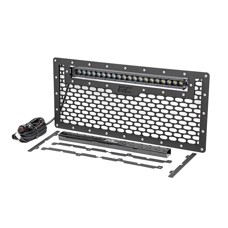 Give the front-end of your JK a unique look with Rough Country’s JK Mesh Grille kit. This grille replacement kit swaps out your Jeep’s seven slots with the eye-catching, head-turning good looks of this aftermarket upgrade. With a unique, laser-cut mesh pattern surrounded by stylish, stainless steel rivets, this grill gives your JK a more menacing look that’s sure to draw attention. Each kit is powdercoated black to resist corrosion and give a long lifespan of good looks. This kit does NOT require you to remove your Jeep front emblem!