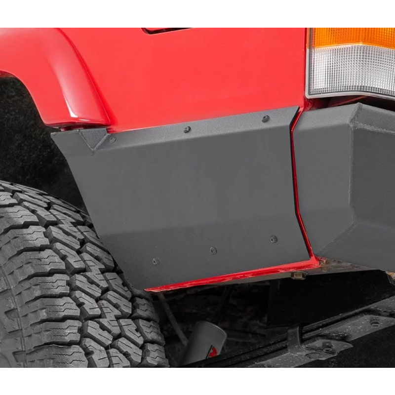 Complete the look with Rough Country’s XJ Rear Lower Quarter Panel Armor. This durable and stylish upgrade hides the unsightly raw steel that is exposed when upgrading to an aftermarket rear bumper, while offering increased protection from rocks, limbs and debris.