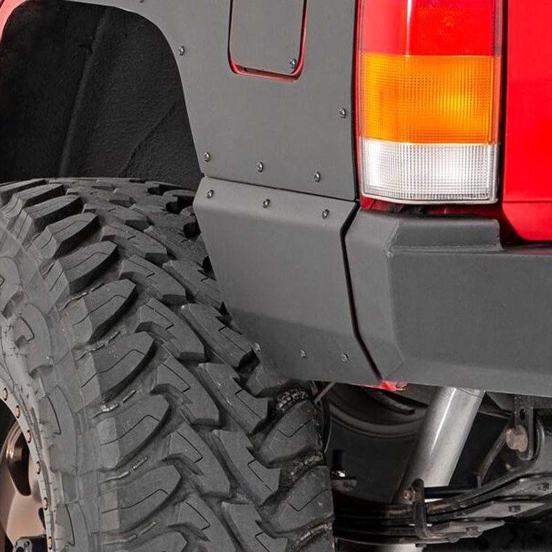 Complete the look with Rough Country’s XJ Rear Lower Quarter Panel Armor. This durable and stylish upgrade hides the unsightly raw steel that is exposed when upgrading to an aftermarket rear bumper, while offering increased protection from rocks, limbs and debris.