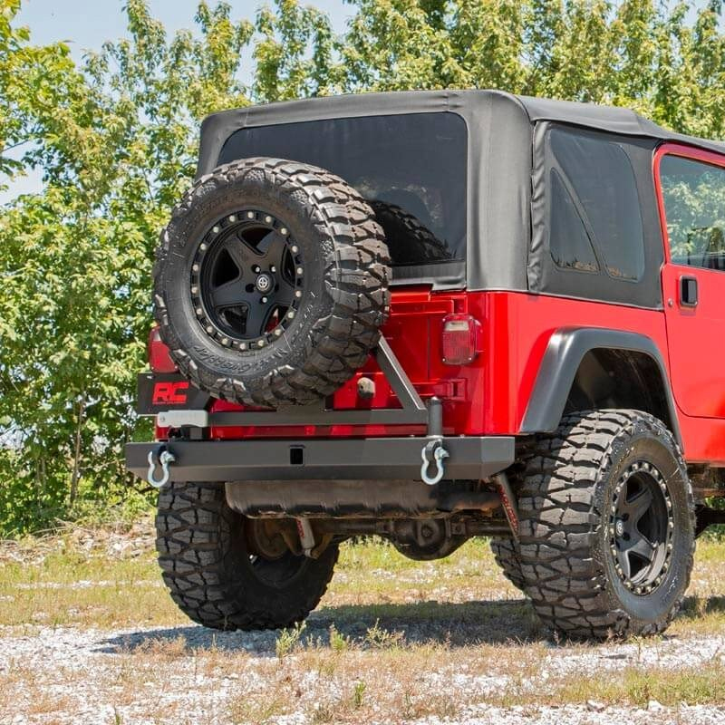 Rough Country’s Classic Rear Bumper with Tire Carrier is a classic design with modern appeal. With bold, but simple angles, this design truly complements the TJ / YJ body style for increased protection that blends in with the look of classic Jeeps. This bumper features a heavy-duty tire carrier attachment capable of running a full-size spare up to 37-inches thanks to a massive, reinforced hinge joint that allows you to swing open the tire carrier for easy access to the rear hatch. A convenient handle locks into place to ensure the tire carrier doesn’t budge when the Jeep is in motion.