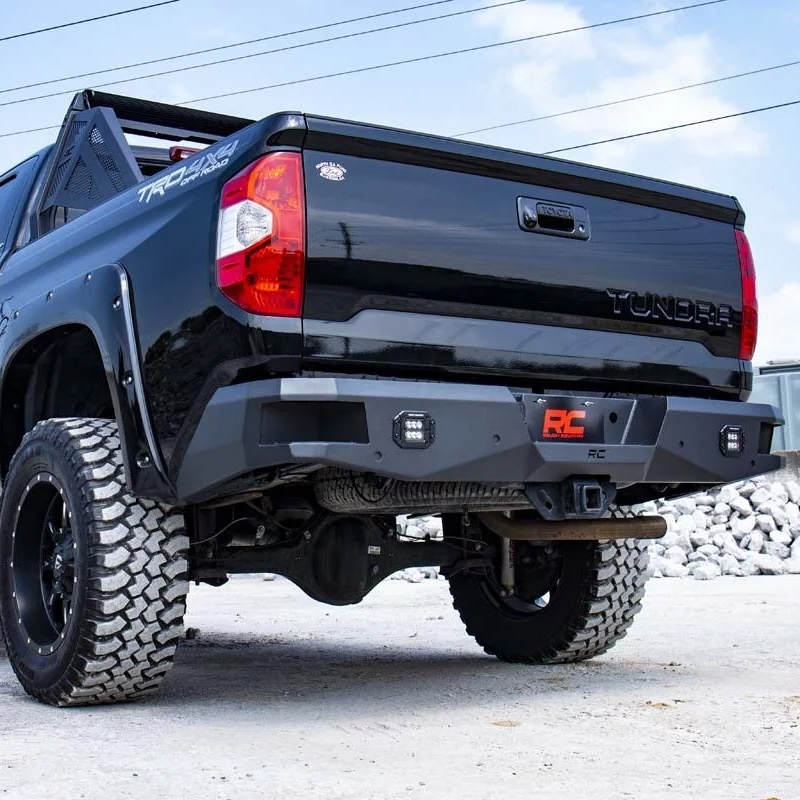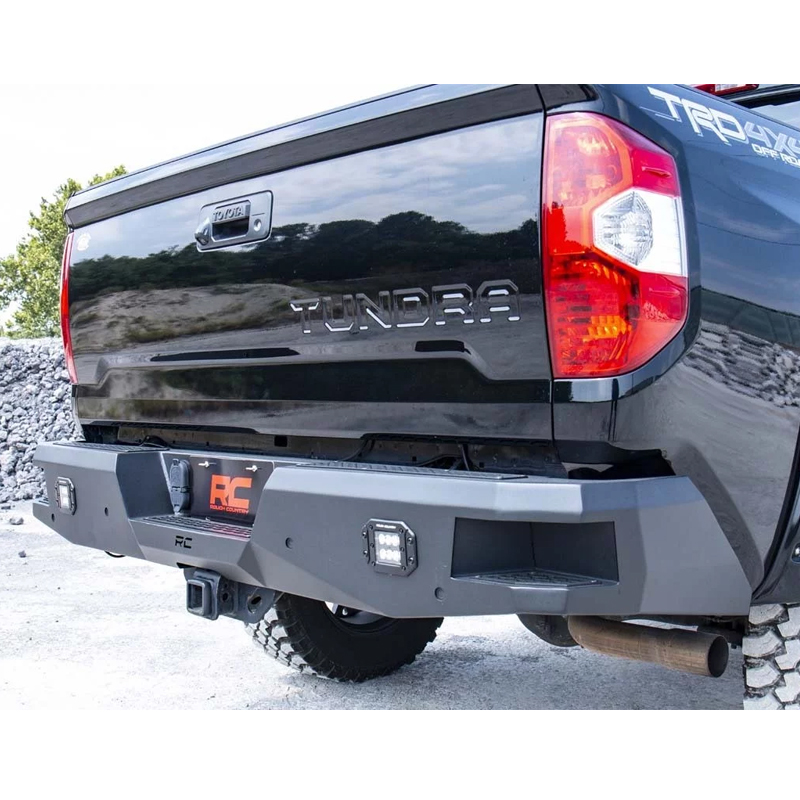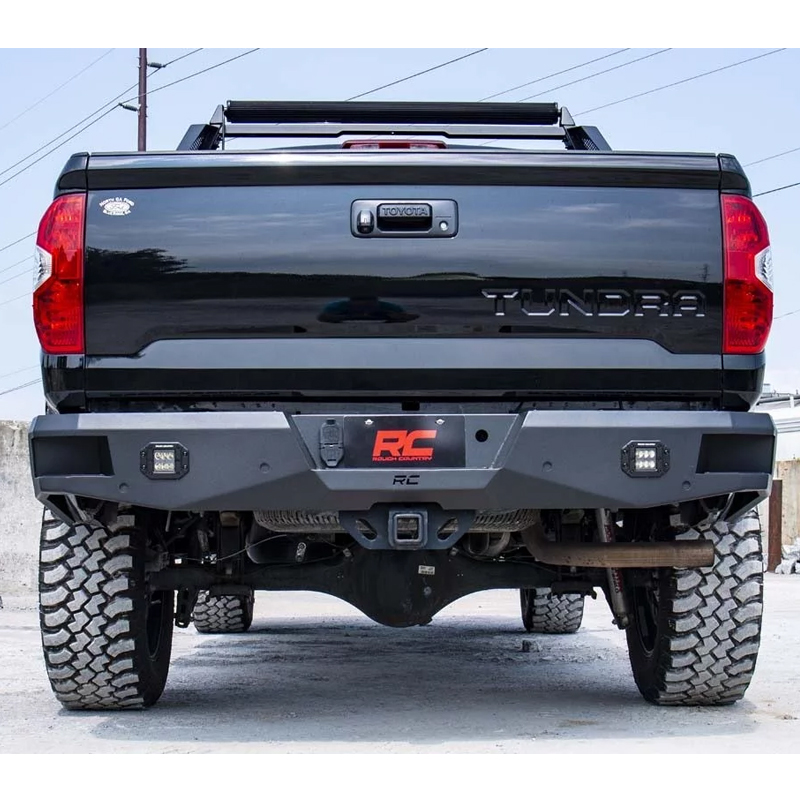 Give the rear of your Toyota Tundra an aggressive, new appearance with Rough Country’s Rear LED Bumper. This easy-to-install upgrade gives your truck an improved look and better functionality. Each bumper features two Rough Country Black-Series 2in LED Flush Mount Cubes for rear illumination, and two integrated steps for easy access to the bed. Rough Country’s Rear LED Bumper is made of a durable, all-steel construction that’s ready to handle whatever you dish out. Each bumper also includes sensor relocators to allow you to retain the vehicle’s anti-collision system. Unlike some aftermarket bumpers for this model, Rough Country’s LED Rear Bumper allows you to retain the factory receiver hitch for towing. Complete the look with Rough Country’s Front LED Bumper for a total transformation of your truck. Includes a 3-year Warranty!