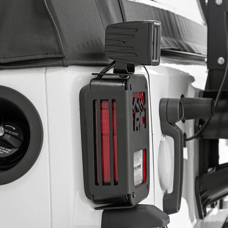 The three-dimensional “shroud” design totally envelops your tail light on all 4 sides, offering considerably more protection than simple add-on bezels found on the market. For even more functionality, Rough Country JK Tail Light Covers feature a standard-sized mounting point on the top of each cover allowing you to mount a small LED Light - like our 2-inch LED cubes - for easy and convenient rear lighting. Hook up to a trailer with ease, or reverse more confidently in off-road scenarios with this handy LED mounting position. Each solid-steel tail light cover is powdercoated black to provide aggressive good looks while withstanding the elements. Best of all, Rough Country’s JK Tail Light Covers feature a Lifetime Replacement Warranty!
