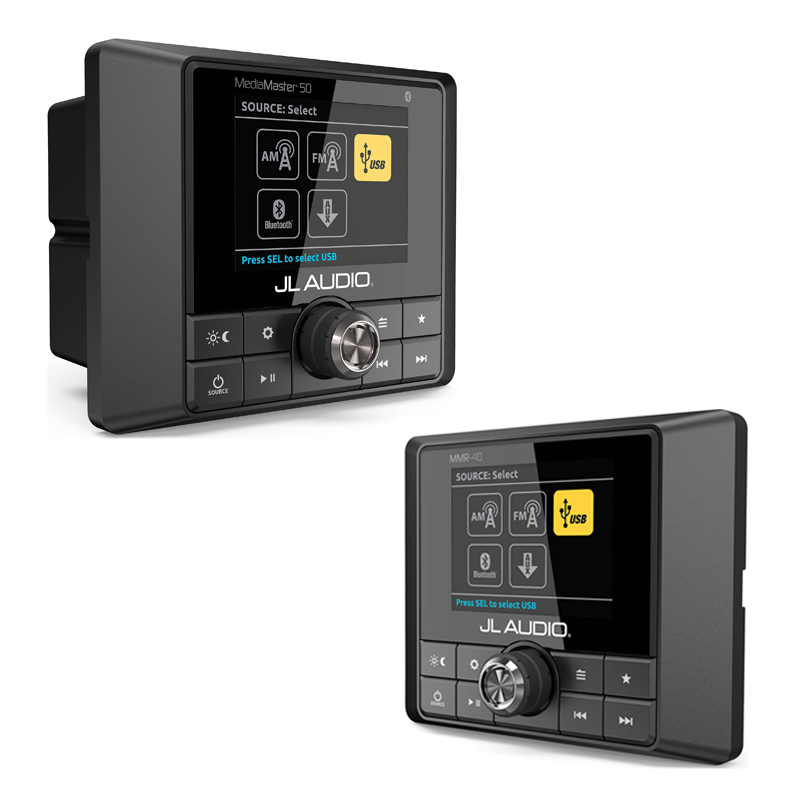 The MediaMaster® 50 is a high-performance, single-chassis, powered source unit, engineered to deliver outstanding fidelity and advanced audio features on your boat, UTV and many other outdoor applications. Equipped with a variety of mechless audio source options, the MM50 includes a Digital AM/FM Tuner, Bluetooth® connectivity, a USB connection for a USB drive or iPhone® and an Analog AUX input, all designed to ensure non-stop playback of your favorite soundtracks, no matter how bumpy the ride. A rugged, weatherproof (IP66 rated) chassis houses a 2.8-inch full-color LCD display, with separate Day/Night lighting themes for visibility, even in bright sunshine. When in motion, you will also appreciate the clean, uncluttered user interface with big text and large backlit controls.