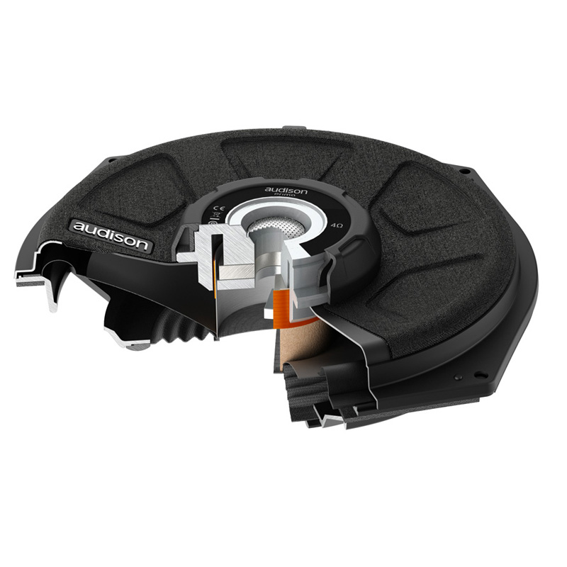 Subwoofers have been designed with electro-acoustic parameters that maximize performance for the factory box available below the seats. The ABS plastic basket, reinforced with fiberglass, and the acoustic structure featuring a front magnet, provide for a minimal installation depth for a perfect compatibility with the whole range. Two 5 mm polyurethane gaskets, supplied, allow the subwoofer to fit perfectly to the box, decoupling it from vibration.