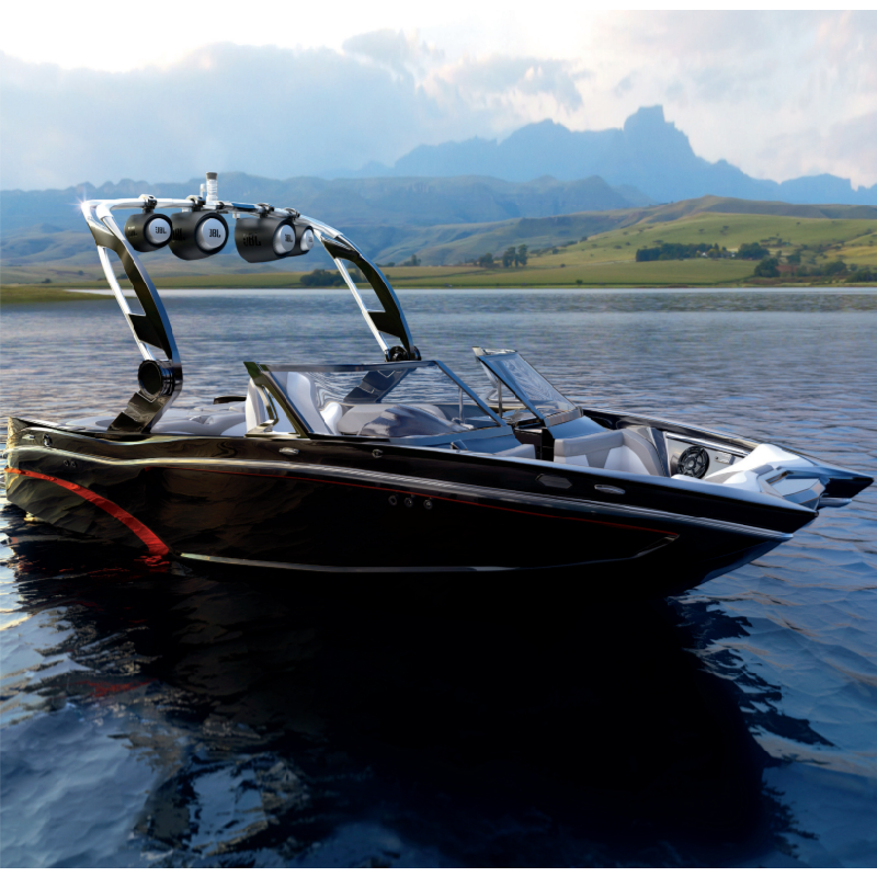 JBL Tower X Marine Speakers include a patent pending angled face speaker design that points the speakers at the rider’s listening position instead of the water at the back of the boat. This provides the rider with excellent sound quality, reduces the smearing effect caused by your music reflecting off the water, and an enjoyable listening experience for everyone else inside the boat.