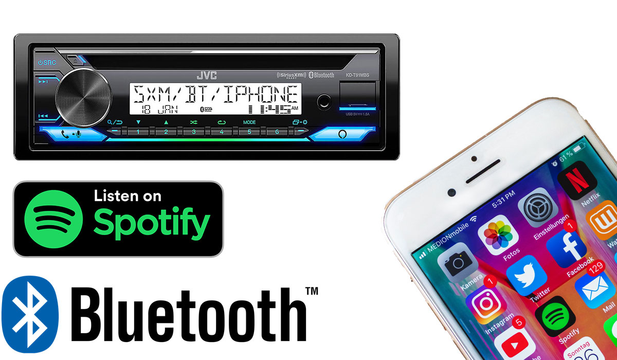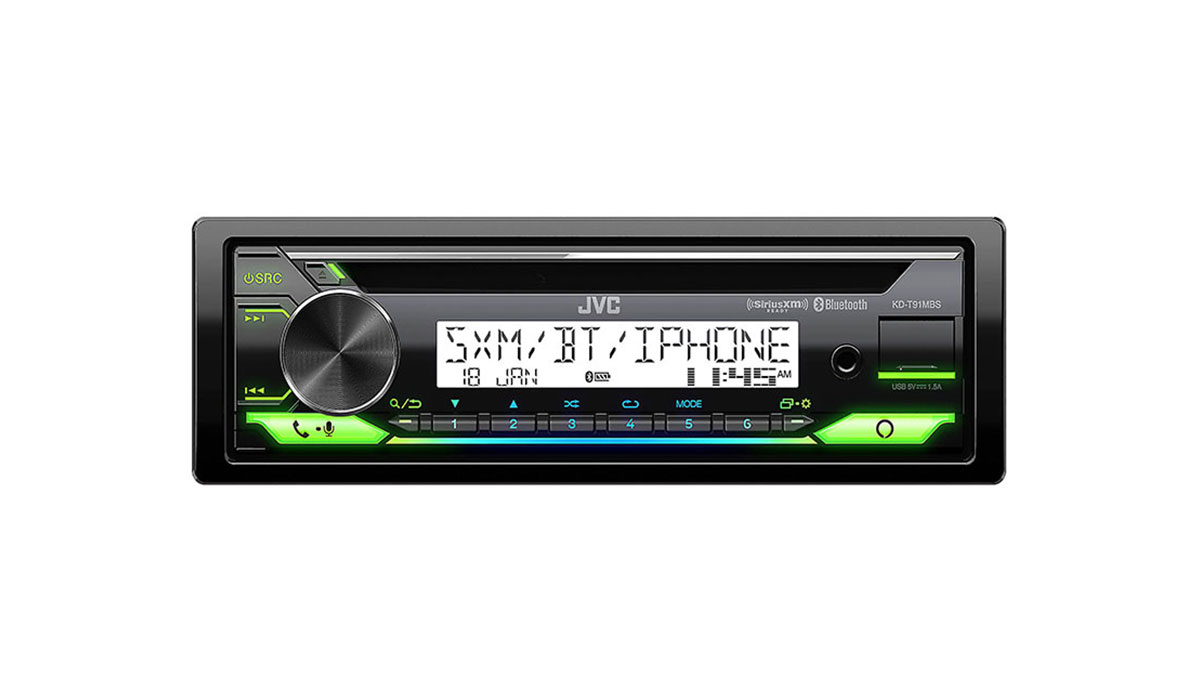The KD-T91MBS has a built-in AM/FM radio tuner with preset stations and supports SiriusXM satellite radio. The system is also compatible with the JVC Remote app, which allows you to control the system from your phone.