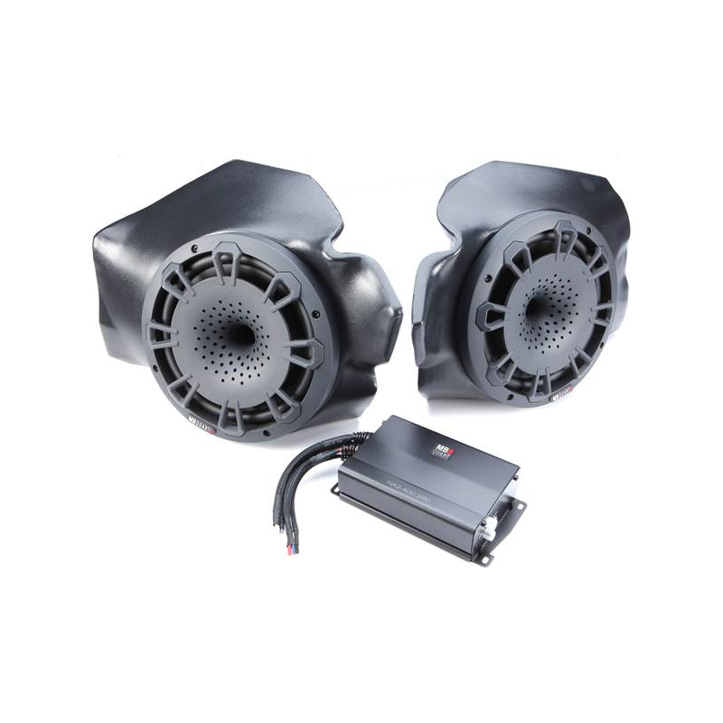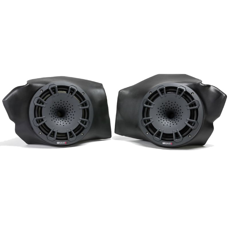 Want better sound in your 2014-up Polaris RZR? These custom-molded kick pod enclosures from MB Quart fit right in and hold a pair of powerful 8" compression horn speakers. The bolt-in pods are designed for your RZR, so installation is easier that you'd think. This kit also includes a powerful 2-channel amplifier.
