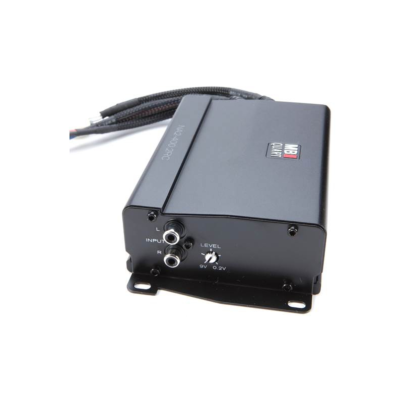 - NA2-400.2RC Amplifier: The MBQR-POD-2 sound system includes an NA2-400.2RC two-channel amplifier for driving the compression horn drivers. The Class-D amp can output 2 x 100w RMS @4? or 2 x 200 RMS @2? and has a frequency response of 20Hz - 20kHz. The amplifier features conformal coated PC boards that resist corrosion from salt spray and moisture, and a Q-Stasis pre-amplifier stage that reduces incoming noise from a headunit, greatly improving sound quality. A dual coil Pulse-Width Modulated power supply keeps a constant steady voltage. The Class-D topology combined with aluminum heat sinks allows the amp to produce the maximum amount of power while keeping it cool.