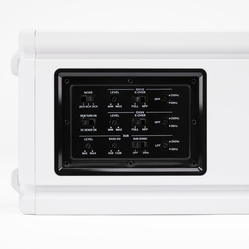 Five channel Nautic waterproof amplifier with marine specific connectors. Top mounted sound contouring with onboard crossovers, bass boost and adjustable input sensitivity all concealed behind top mounted controls. Channel 5 is 1 ohm stable and includes a bass remote.Meets or exceeds IPX standards for waterproof and dustproof. Q-Stasis Pre Amplifier Stage: Maximum low voltage signal from the source unit comes into the amplifier circuit with minimal distortion.