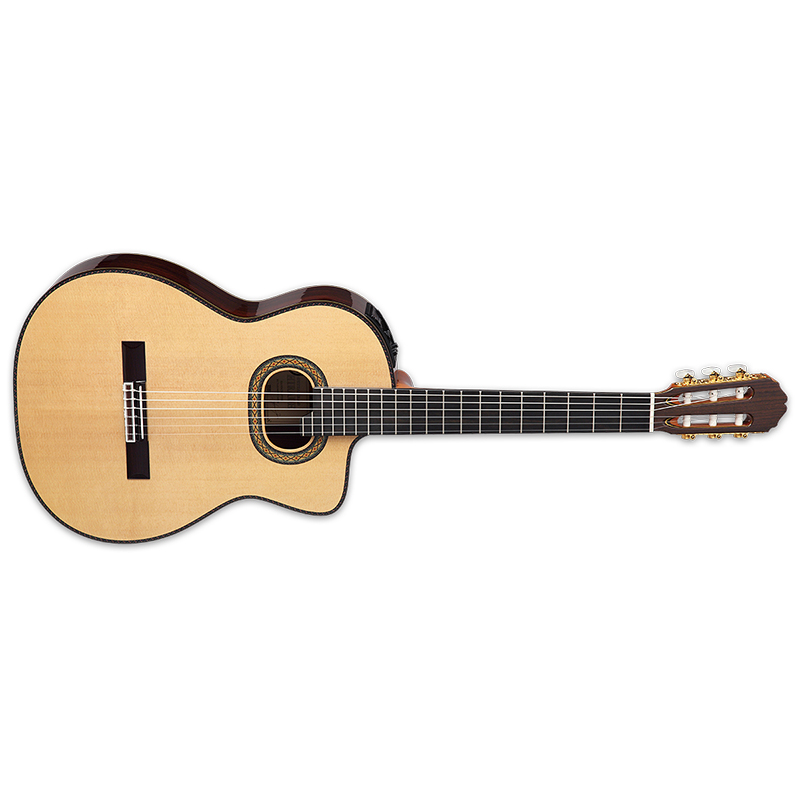 Takamine Hirade Classical Guitar with Cutaway, Solid Spruce Top, Solid Rosewood Back and Sides, Oval Soundhole, Gloss Finish, Gold Hardware, CTP-3 Cool Tube Electronics with Case