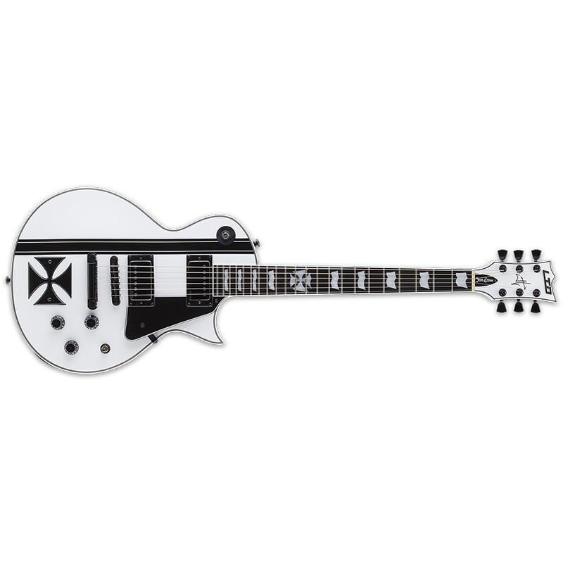 The LTD Iron Cross is a Signature Series model of James Hetfield, the frontman of Metallica and one of the world's most highly respected rhythm guitar players in any genre. The Iron Cross is based on James' personal custom instrument design, and features set-neck construction of a mahogany body with maple cap, and a three-piece mahogany neck with ebony fingerboard and 22 extra-jumbo frets with an Iron Cross inlay at the 12th fret. The LTD Iron Cross is powered by James' own EMG JH SET active pickups, and includes a TonePros locking TOM bridge and tailpiece. Available in Snow White finish with black stripe graphic and iron cross fixture.