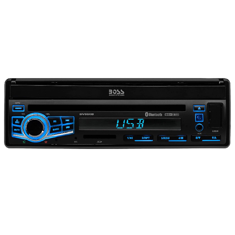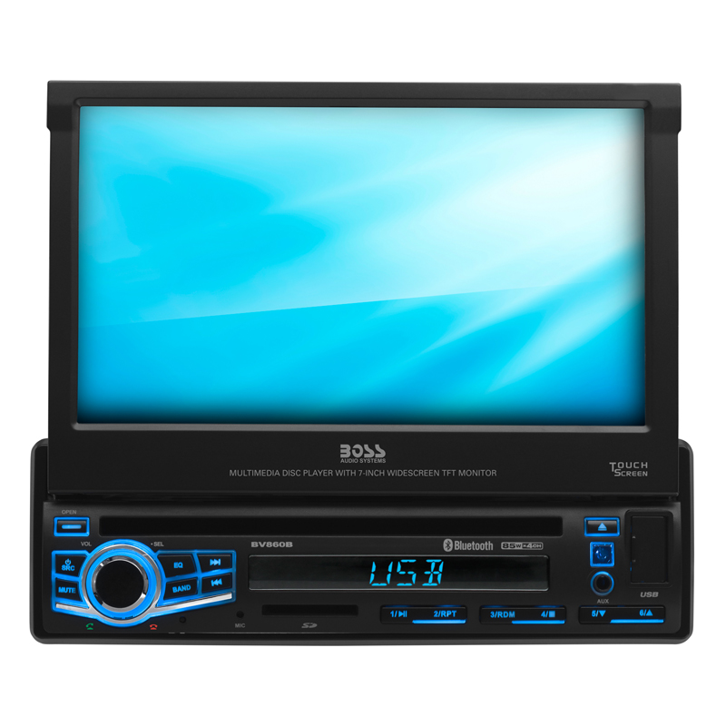 Boss Audio BV860B 1-DIN 7" DVD Receiver with Motorized Touchscreen, Bluetooth, Audio Streaming, AUX, and Rear Camera Input