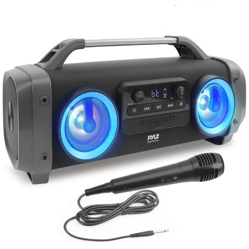 Portable Bluetooth Speaker - Compact & Portable Stereo System - Travel-Friendly Boom Box Speaker Style - Includes Wired Microphone for Karaoke Fun - FM Radio with Digital LCD Display - Built-in Rechargeable Battery