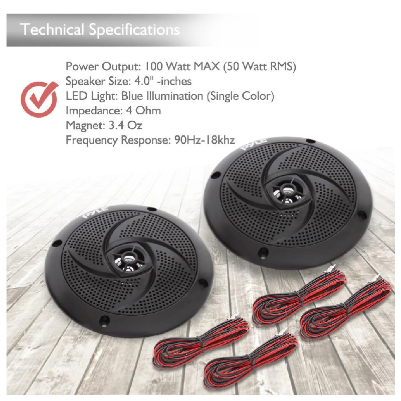 Pyle PLMRS43BL - Marine 4" 100W Peak Power Handling, 4-Ohms, 2-Way Low-Profile Marine Led Speakers