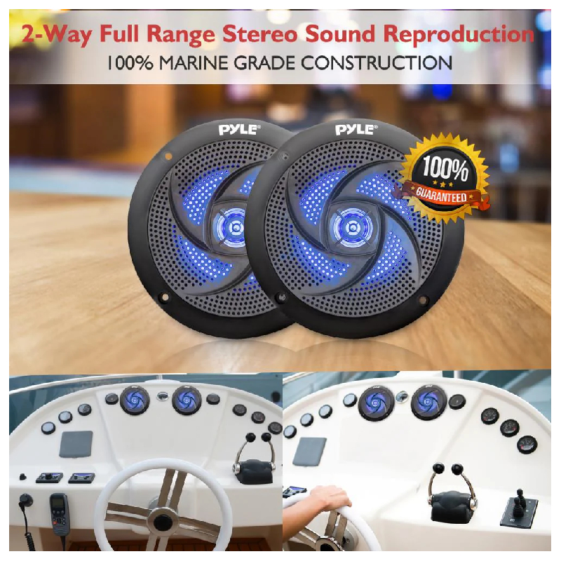Pyle's marine speakers are built using robust aluminum and other durable materials, ensuring a sturdy audio system. These speakers are waterproof, capable of enduring water exposure, and weather-resistant to resist sun damage. They also feature LED lights for additional visual appeal. The package includes a manual with straightforward and clear installation instructions.