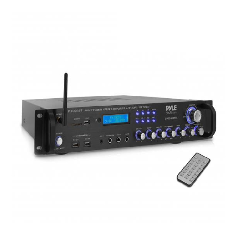 Pyle Bluetooth Home Theater Hybrid Amplifier - Bluetooth Hybrid Amplifier Receiver - Home Theater Pre-Amplifier with Wireless Streaming Ability, MP3/USB/SD/AUX/FM Radio (3000 Watt) - Home Theater Audio Receiver System - High-Powered Hybrid Pre-Amplifier - Built-in Bluetooth for Wireless Music Streaming - Digital LCD Display with FM Radio - Connect & Stream Audio from External Devices - 550 Watt @ 4 Ohm - MP3 Audio File Playback Support - USB Flash & SD Memory Card Readers - Dual USB Device Charge Ports - Front Panel Button & Rotary Controls - LED Backlight Illumination with Dimmer Control - RCA (L/R) Audio Input/Output Jacks - 300 Watt @ 8 Ohm - Dedicated RCA (L/R) Subwoofer Output Jacks - Screw-Type Speaker Terminal Binding Posts - Headphone Jack, 1/4’’ -inch - Aux (3.5mm) Input Jack - (2) 1/4’’ Microphone Inputs - Microphone Volume/Tone/Echo Control - Audio Source Configuration Settings - Built-in Cooling Fan - Universal Rack Mount Amplifier Design Bluetooth Connectivity: - Receives Wireless Signal for Audio Streaming - Works with All of Your Favorite Devices - (Smartphones, Tablets, Laptops, Computers, etc.) - Bluetooth Version: 2.1 - Wireless Range: 35’+ ft. What’s in the Box: - Hybrid Pre-Amplifier - Remote Control - Rack-Mount Brackets - Power Cable Power Output: 3000 Watt MAX - 850 Watt @ 2 Ohm.